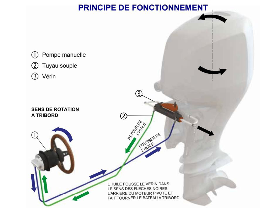 En fonction du nombre de postes de pilotage, du nombre de moteurs hors-bord à actionner, de l'addition d'un groupe électro-hydraulique pour pilotage automatique, d'autres éléments viendront se greffer à la composition de base.