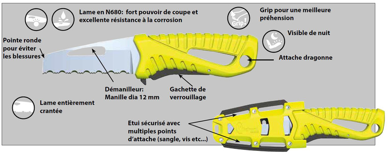 • Couteaux développés spécifiquement pour les opérations de sauvetage et les sports extrêmes (voile légère, course au large, sports en eaux vives etc...).