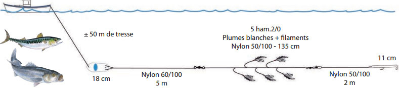 Traîne avec planchette assurant une nage et un équilibre parfait. Ligne montée par des pêcheurs confirmés et utilisant les meilleurs nœuds, dont la ligne de traîne AQUA-BAR est consacrée à la pêche au bar et au maquereau.